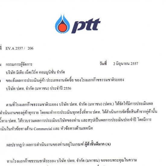 ขอบคุณผลประเมินคู่ค้าจาก ปตท. 0 02/06/2014 ทางบริษัท ขอขอบคุณทาง ลูกค้า โรงแยกก๊าซธรรมชาติระย... อ่านเพิ่ม...