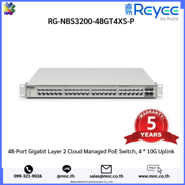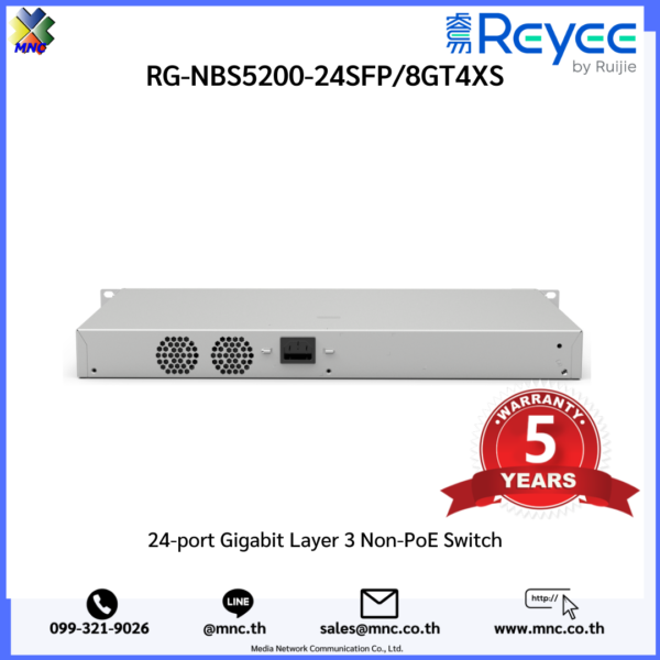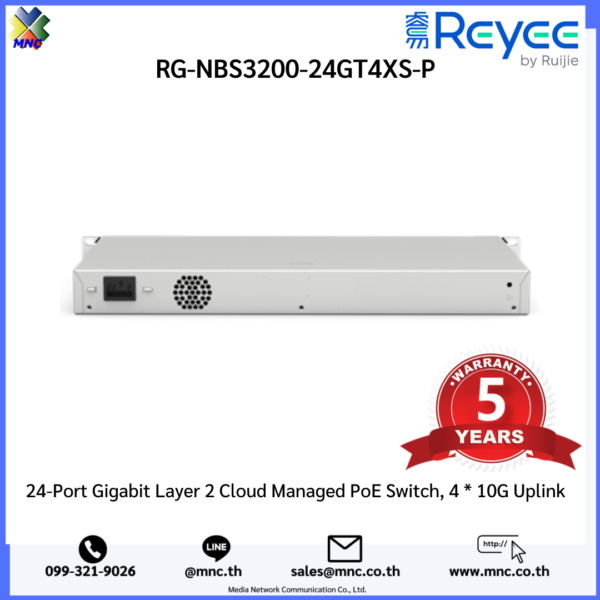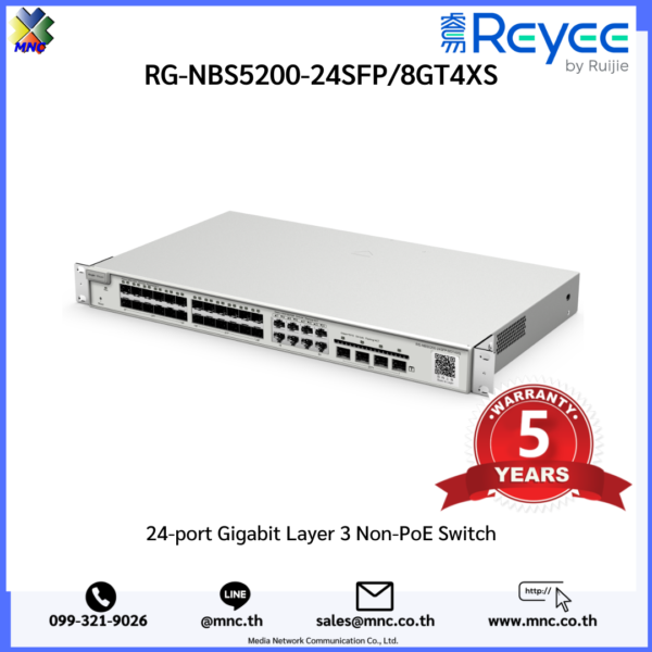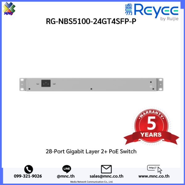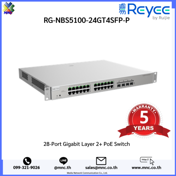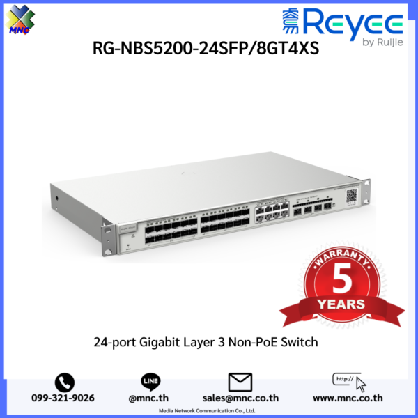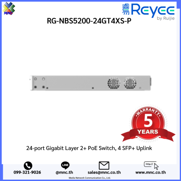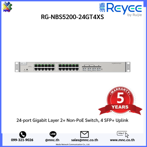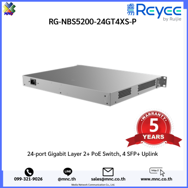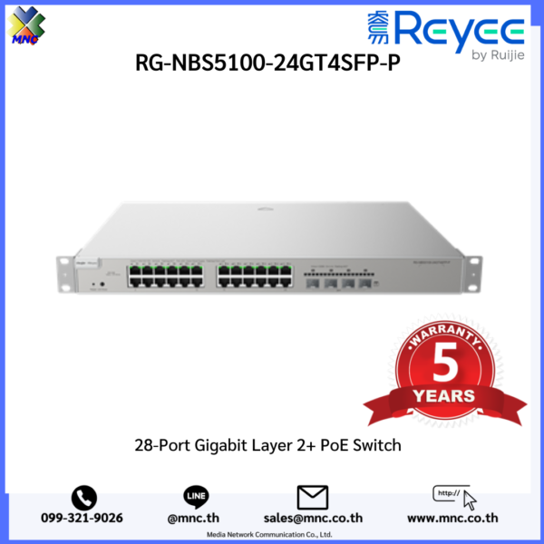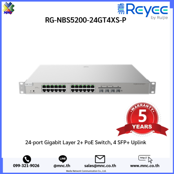 RG-NBS5200-24GT4XS-P, Reyee 24 × 10/100/1000Base-T copper ports with auto-negotiation, 4 × SFP+ ports