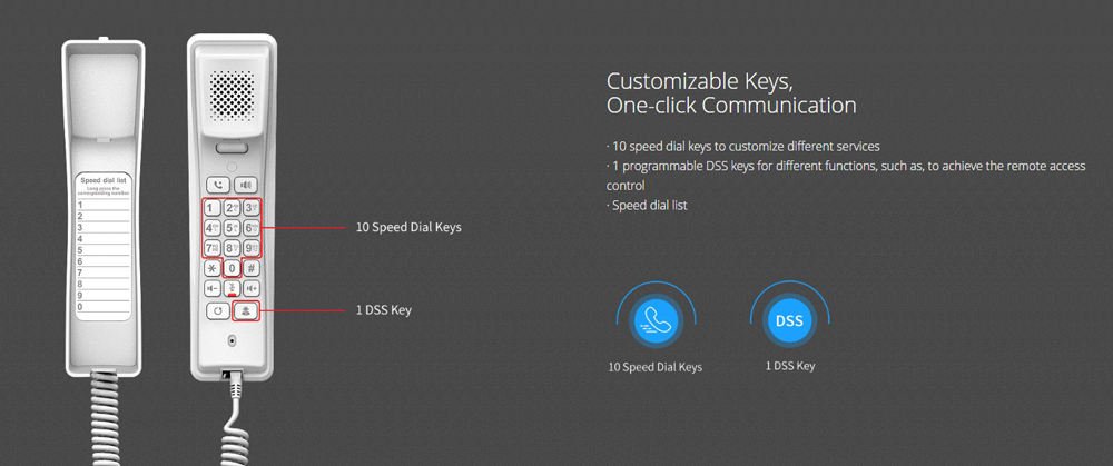 Tiny and stylish, Fanvil H2U compact IP phone possesses brand new features including 2 SIP lines, 10 speed dial keys, 1 programmable DSS key and a HD speaker on handset. Supporting desktop and wall-mounted mode, PoE and power supply charging mode, Fanvil H2U is more than a hotel phone and also can be applied in multiple scenarios, such as school, hospital, supermarket and residence.