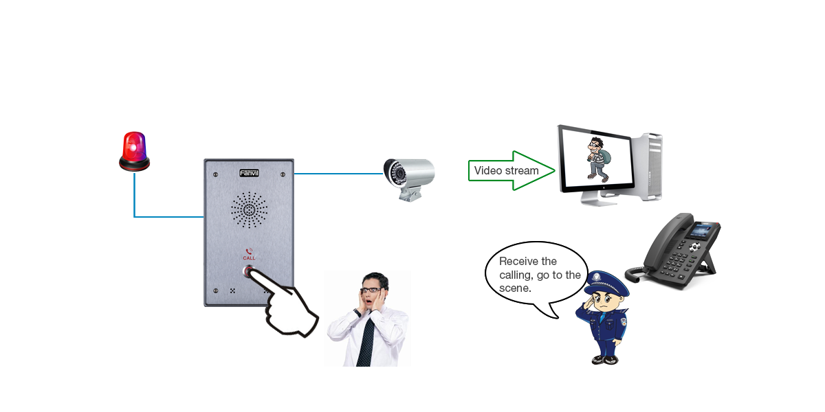 Support two output short circuits for video surveillance and alarm light, and two input short circuits for the door phone button and emergency button.
