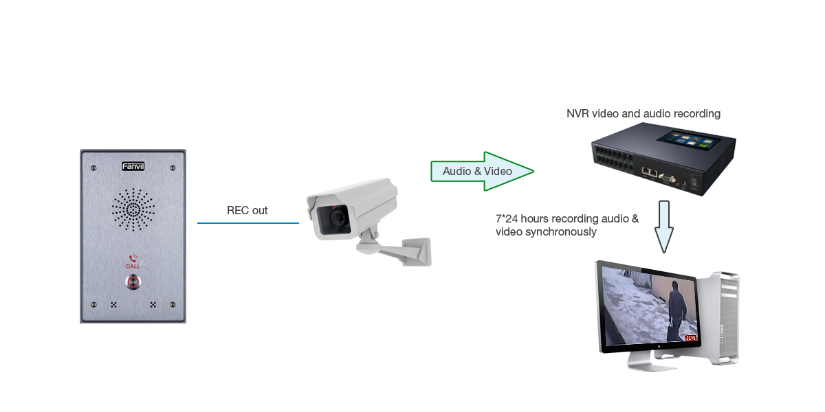 Support REC out connect port, connect with the audio input port of camera or digital recording equipment, realize 24-hour monitor