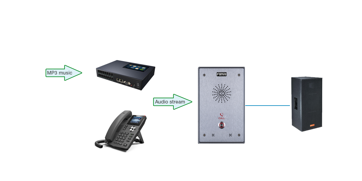 Connect with an active speaker or loudspeaker, broadcast message or music