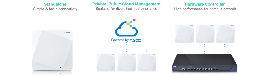 Upon the uprising challenges of management efficiency and wireless security, all Ruijie enterprise APs support hybrid management mode. Either deployed as standalone AP (Fat mode) or managed AP (Fit mode), the AP will detect the operation mode automatically without extra effort on firmware upgrade. For additional security and operation, we recommend the enterprise customers to choose either one of the below wireless controller options depending on the functionality and capacity: