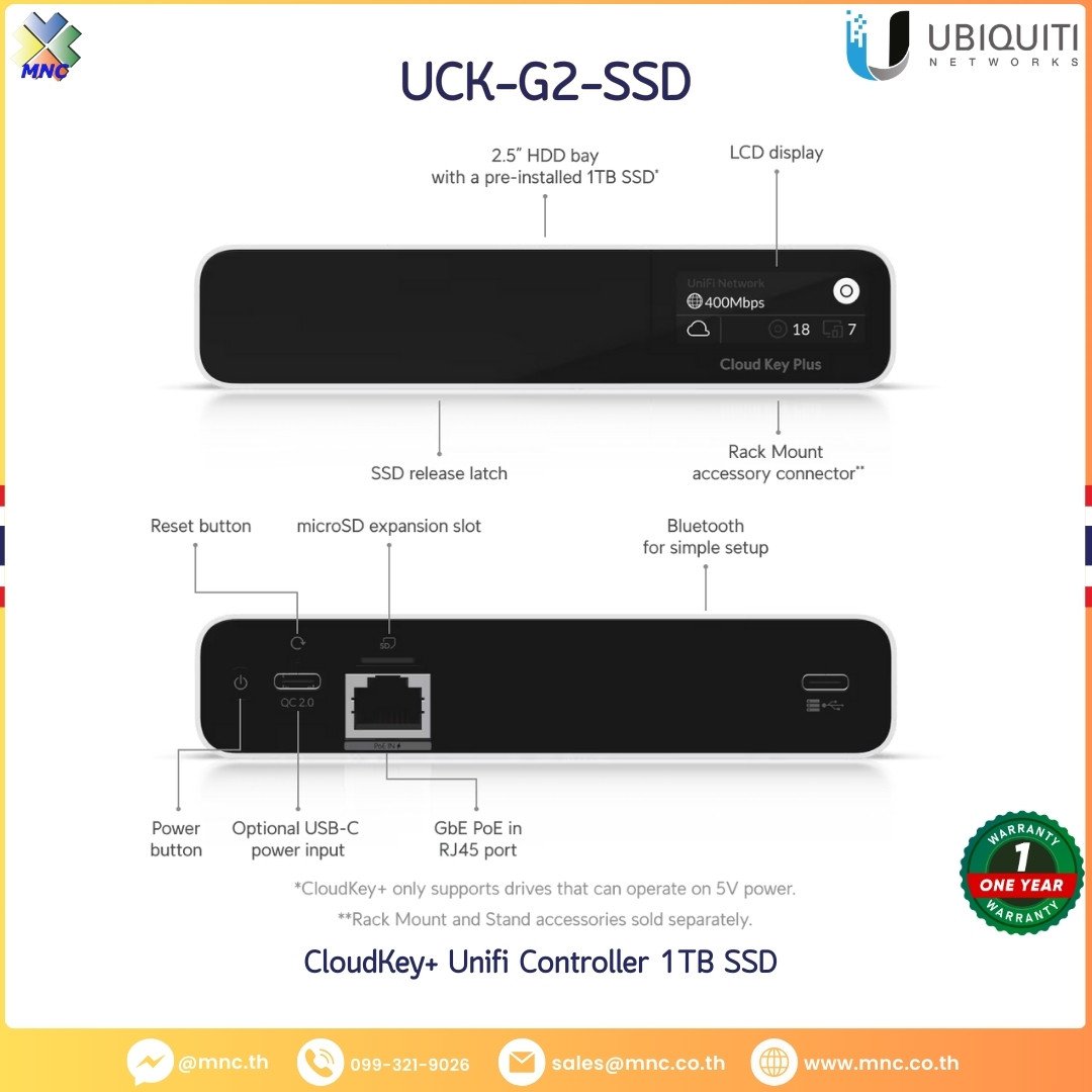 Network and Protect Controller กับ 1 TB HDD ใช้งานสำหรับ เป็นที่เก็บข้อมูล วีดิโอ สามารถอัพเดทสูงสุดได้ที่ 5 TB. จัดการเครือข่าย UniFi และอุปกรณ์วิดีโอของคุณ พร้อมกันด้วย UniFi Cloud Key G2 Plus แบบ Multi-application ใหม่ ออกแบบมาเพื่อ การปรับใช้ง่าย UCK-G2-Plus สามารถกำหนดค่าได้ อย่างรวดเร็ว ผ่านบลูทูธ โดยใช้แอพพลิเคชั่นบนมือถือ UniFi Cloudkey Gen2 Plus มีจอแสดงผลด้านหน้า แสดงสถิติระบบที่สำคัญสำหรับฮาร์ดแวร์ เครือข่ายของ UniFi และ กล้องวิดีโอ UniFi Protect แบตเตอรี่ในตัว ช่วยป้องกันการสูญเสียพลังงาน สำหรับที่เก็บข้อมูลวิดีโอนั้น ยังมี HDD 1 TB ซึ่งสามารถอัปเกรดเป็น 5 TB